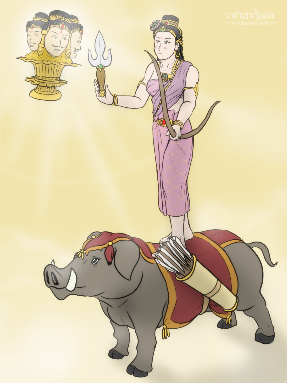 "ทรงพาหุรัดทัดดอกบัวหลวง อาภรณ์แก้วโมรา (มรกต) ภักษาหารโลหิต พระหัตถ์ขวาทรงตรีศูล พระหัตถ์ซ้ายทรงคันธนู เสด็จยืนมาเหนือหลังวราหะ (หมูป่า) เป็นพาหนะ"