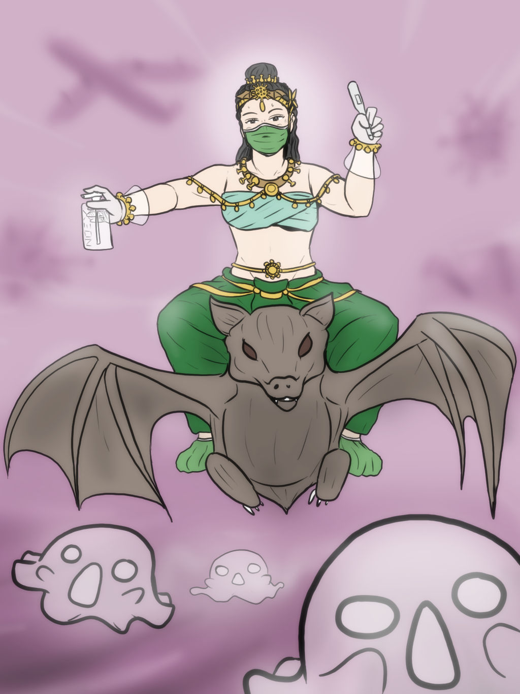 "นางสงกรานต์ปีนี้ นามว่า นางโคโรน่าเทวี ใบหน้าสวมแมส(mask) พระหัตถ์ซ้ายถือปรอทวัดไข้ พระหัตถ์ขวาถือเจลแอลกอฮอล์ล้างมือ ทรงหลังค้างคาว"