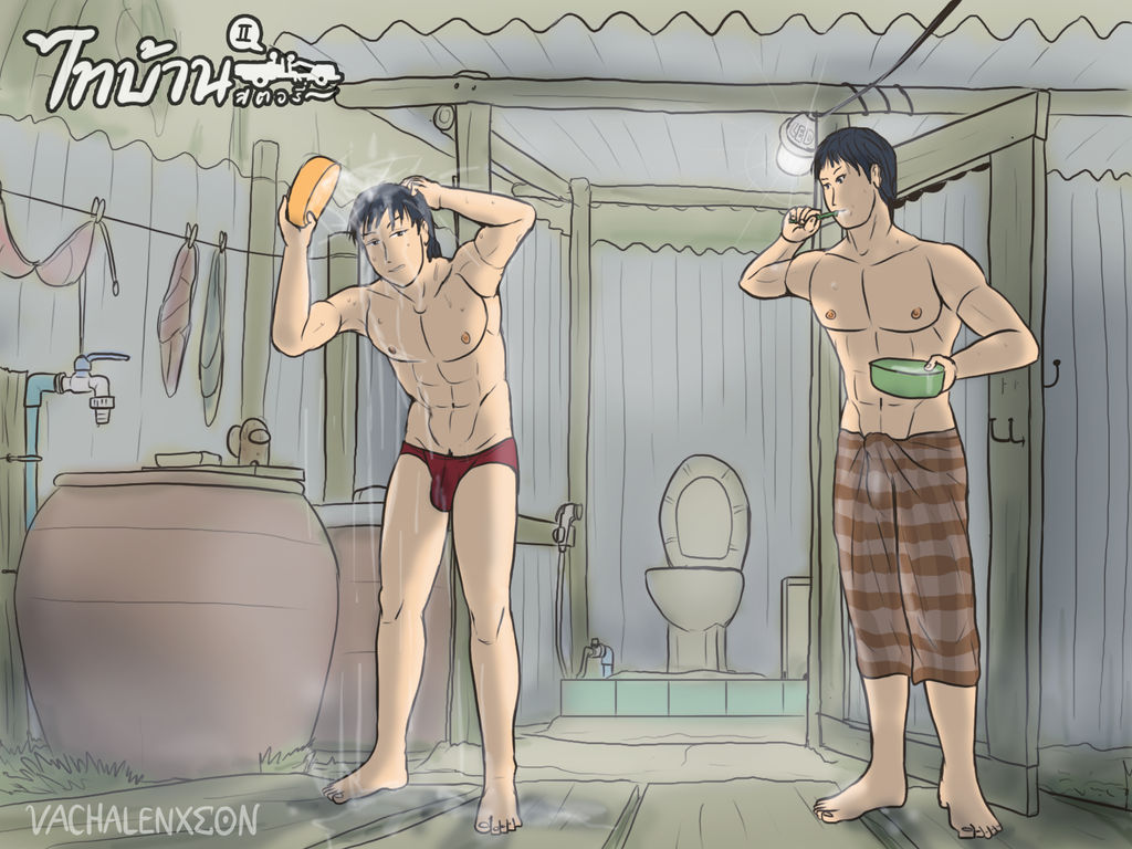 ต่อด้วยมุมมองที่ไหลต่อเนื่องมาจากวันส้วมโลกแค่ 1-2 วัน กับการผ่อนคลายความเหน็ดเหนื่อยแบบบ้านๆ มีแหล่งน้ำไหลผ่านก็ผลัดเสื้อผ้าออกให้เหลือแค่ผ้าขาวม้าผืนเดียว แต่รอบนี้มาในแนวผ้าถุงเต็มรูปแบบ และย้ายจากลำห้วยลำคลองธรรมชาติ มาเป็นแนวคลองส่งน้ำชลประทานแทน