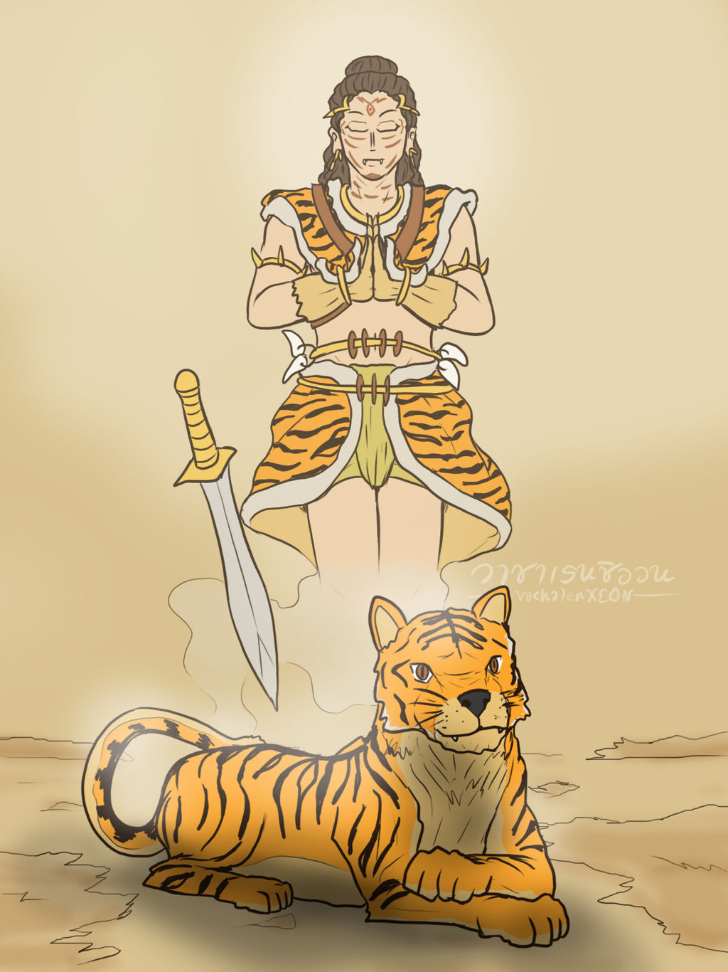 ในที่นี้คือการกำเนิดใหม่ เปลี่ยนสภาพจากสัตว์เดรัจฉานตัวน้อยๆ เป็นผู้กล้าในร่างมนุษย์ เหมือนกับสหายของเขาที่เป็นผู้ถูกล่าอย่างวัว (ส่วนหนึ่งในนิทานพื้นบ้าน หลวิชัย-คาวี หรือ เสือโคคำฉันท์)
