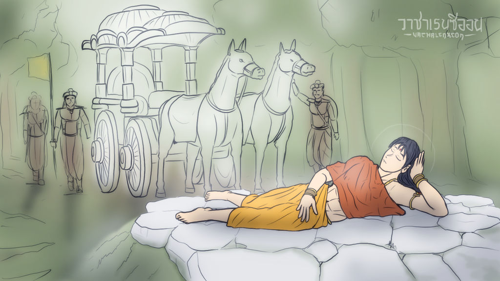 มณีเมขลา : ลมอะไรพัดพาข้ามาที่มหาบพิตรราชฐานแห่งนี้ ไม่ได้พบเจอท่านผู้มีบุญญาธิการนานโข ตั้งแต่ข้าได้ช่วยท่านพ้นจากห้วงมหาสมุทธอันเวิ้งว้างนั้นด้วยผลบุญกุศลอันแรงกล้า เหตุใดท่านจึงได้รับคัดเลือกขึ้นสถาปณา เป็นมหาบพิตรแห่งมิถิลานครนี้เล่า??